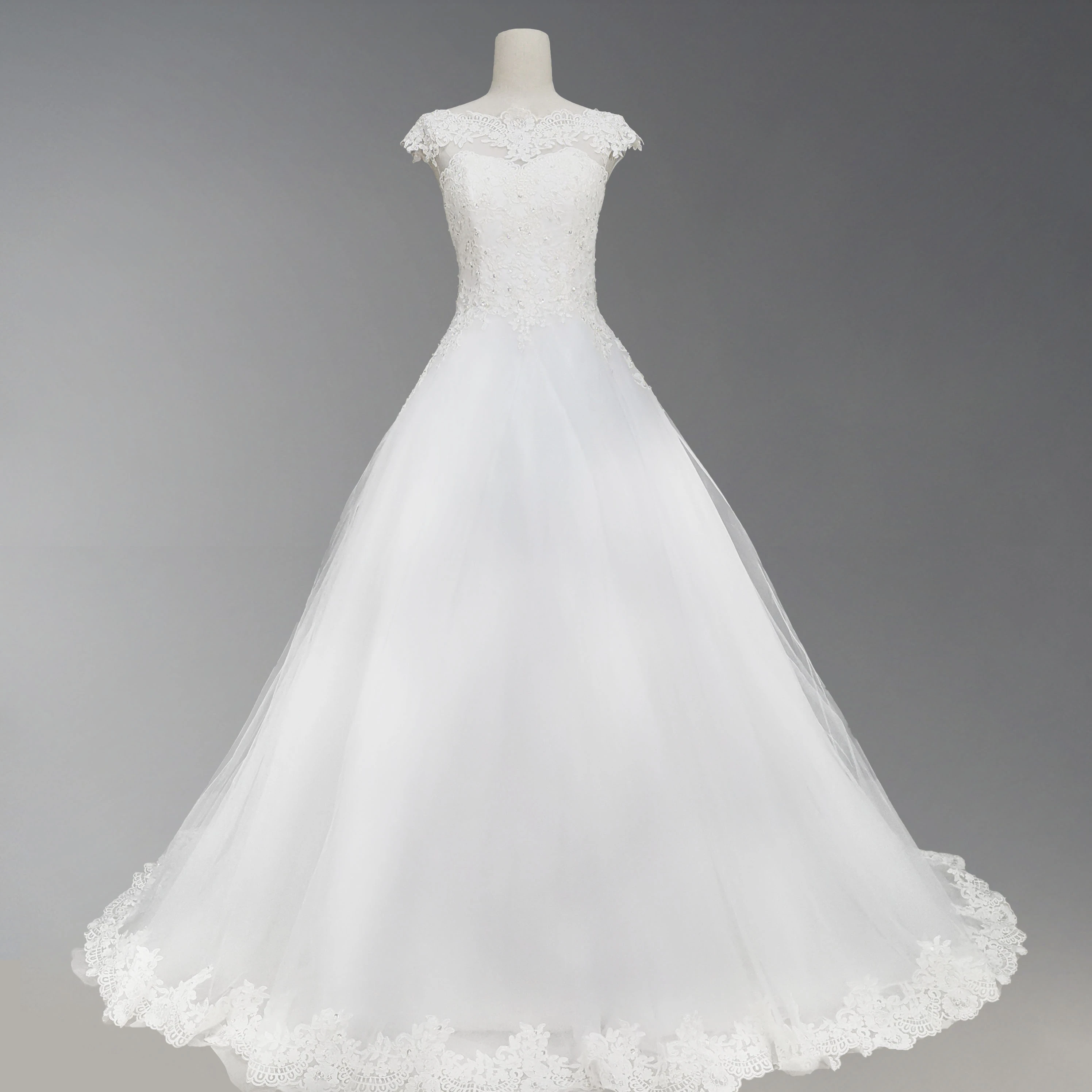 Elegant but budget discount bridal wedding dresses for sale in uk with the latest fashion ball gown bateau lace tulle court train wedding dress.